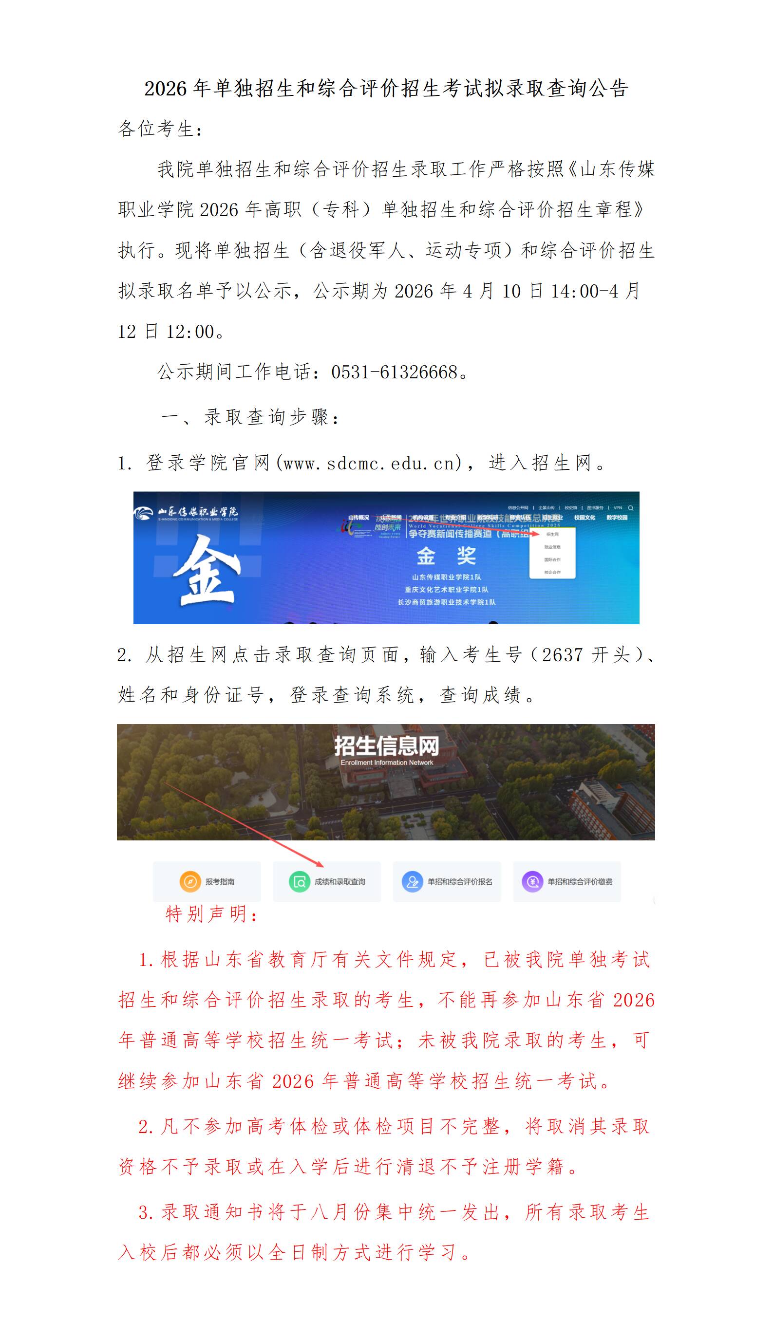 山东传媒职业学院2026年单独招生和综合评价招生考试成绩查询公告及成绩复核申诉渠道