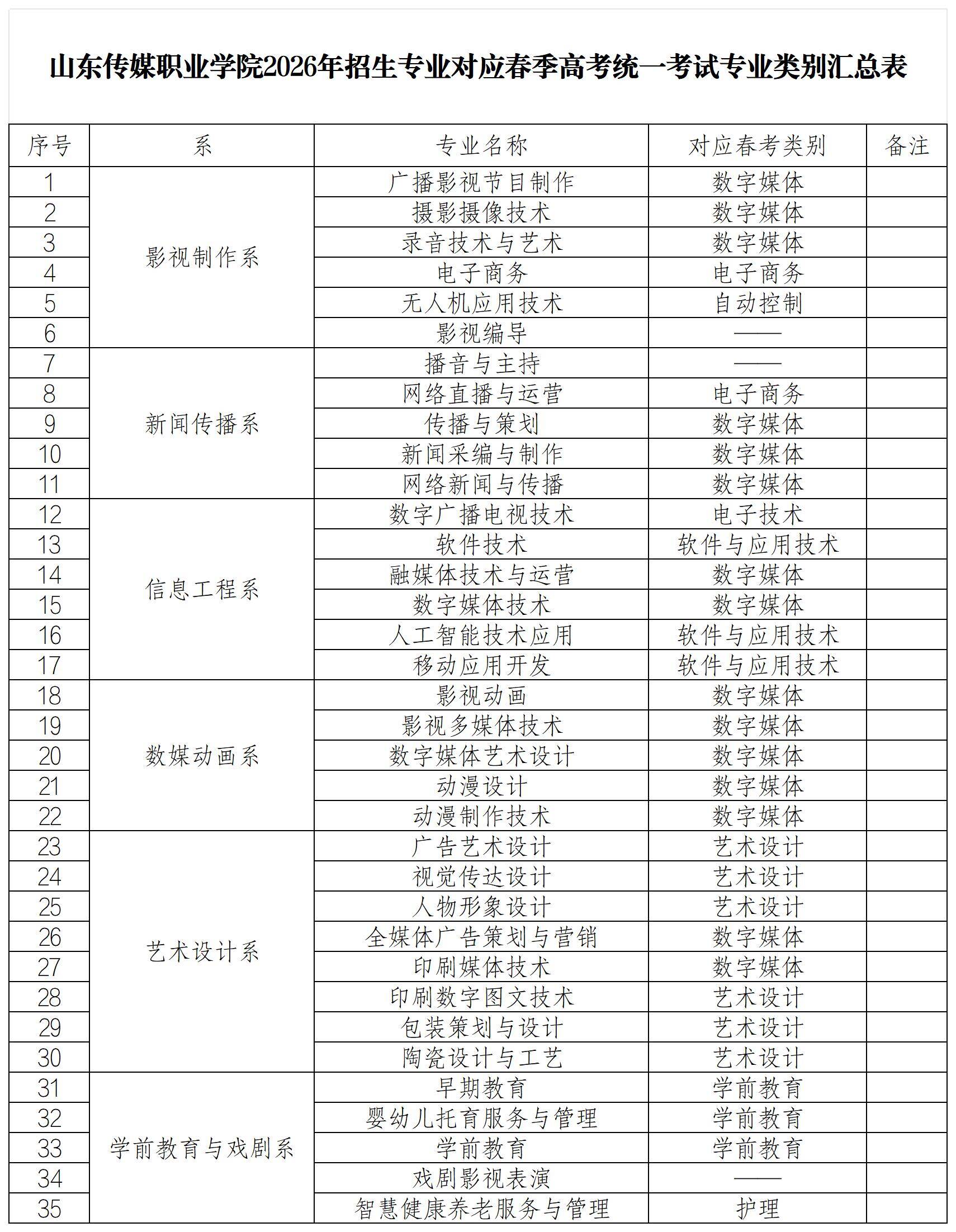 山东传媒职业学院2026年招生专业对应春季高考统一考试专业类别汇总表