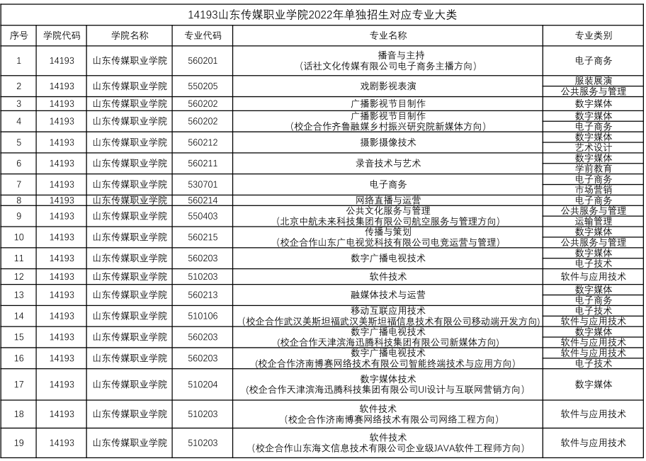 山东传媒职业学院2022年单独招生对应专业大类