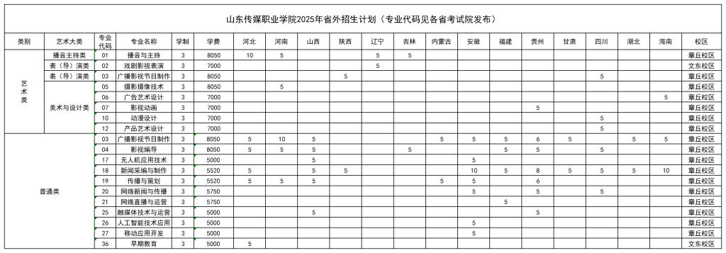 山东传媒职业学院2025年招生计划(省内常规批、艺术批、春季高考批,省外计划)