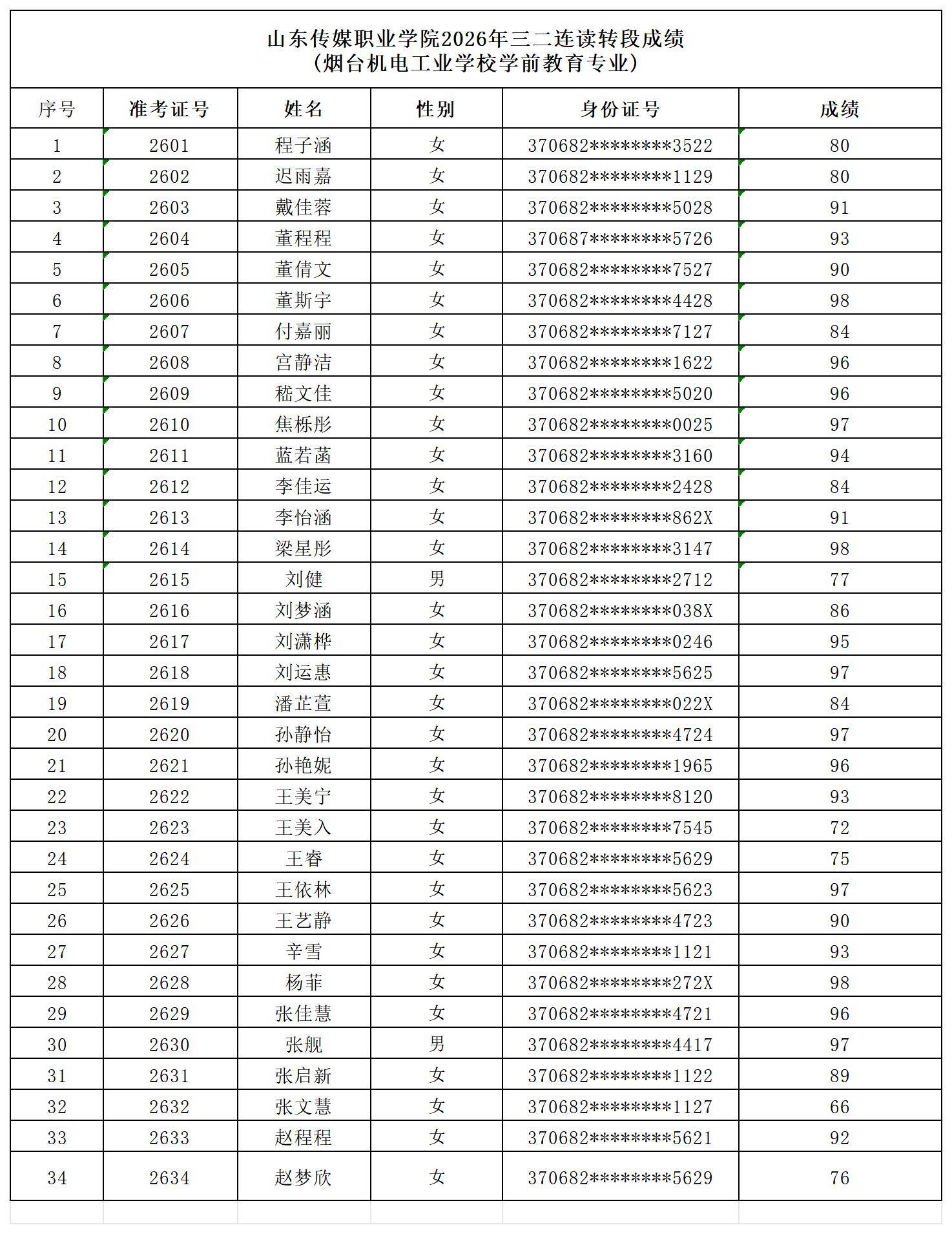 山东传媒职业学院2026年三二连读转段成绩(烟台机电工业学校学前教育专业)公示