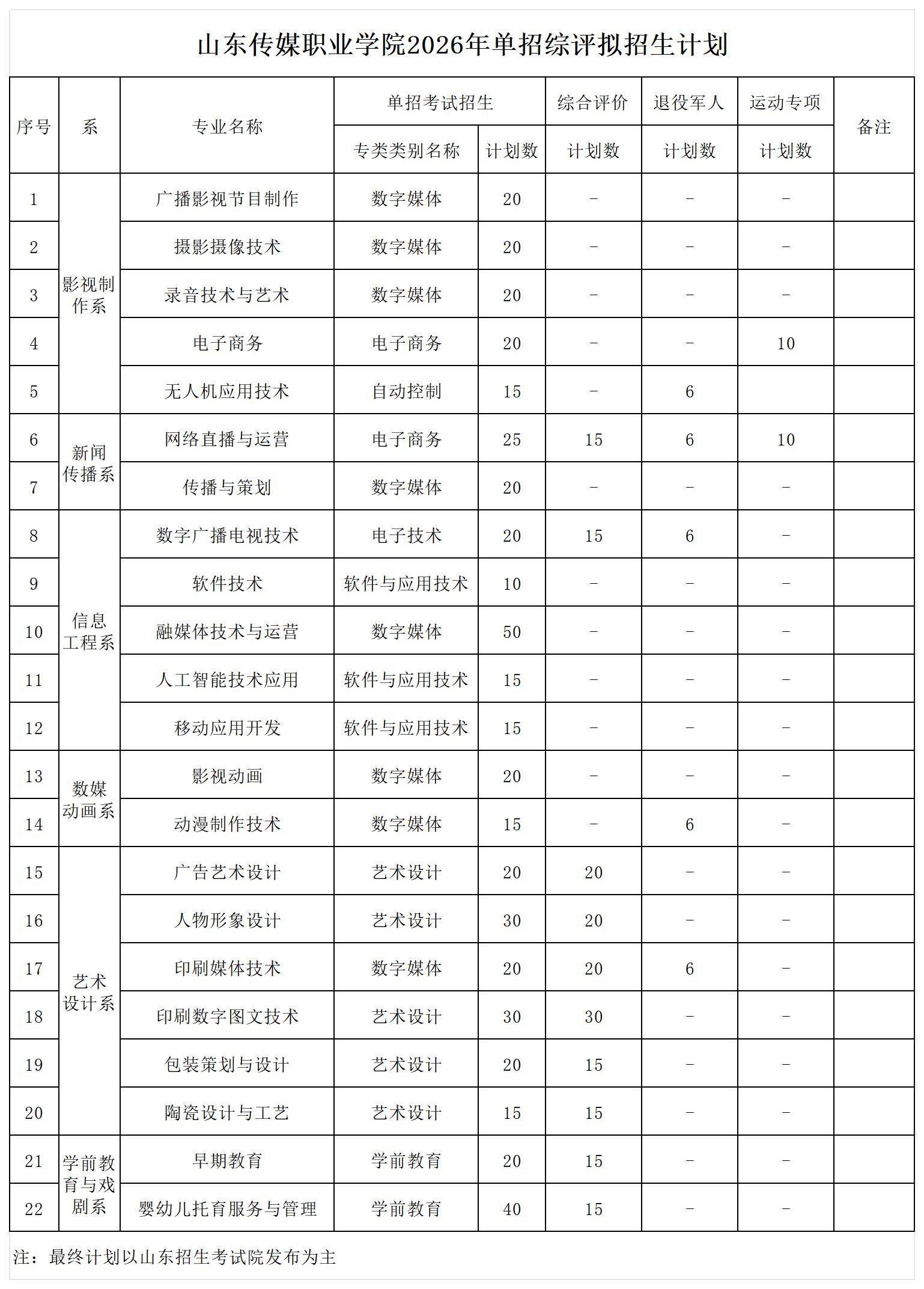 山东传媒职业学院2026年单独考试与综合评价拟招生计划